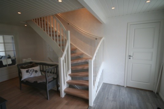 • Trapper får vi fra Eiktrapp : det leveres trapper med hvite vanger og spiler, med eikeimitasjon i trinn.